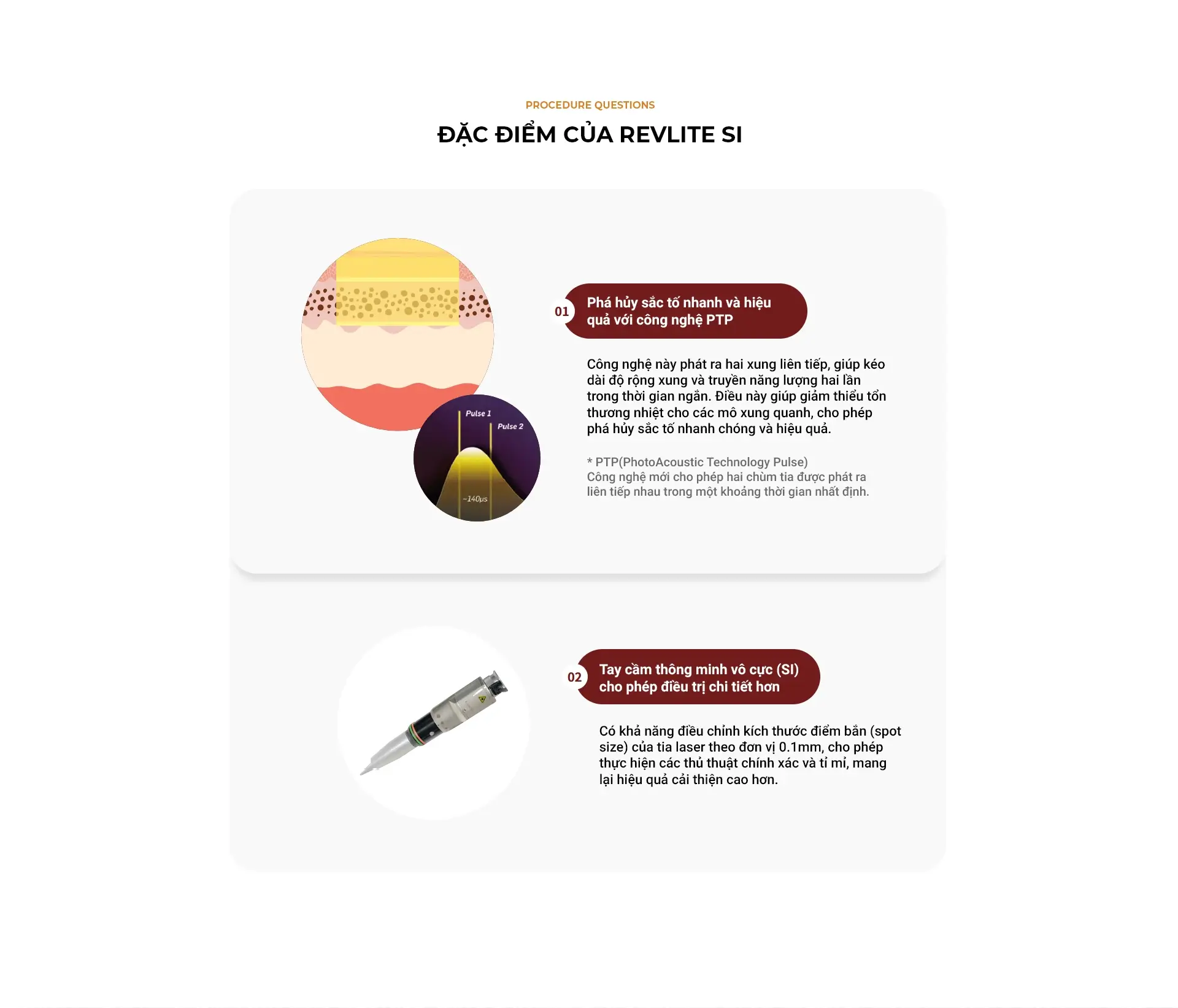 Revlite SI phát ra năng lượng cao trong thời gian ngắn một cách tức thì, nhắm chọn lọc vào sắc tố melanin tồn tại ở biểu bì và hạ bì của da, phân hủy các hạt sắc tố thành mảnh nhỏ để cơ thể tự nhiên hấp thụ và loại bỏ, nhờ đó mang lại làn da sáng và sạch sẽ.