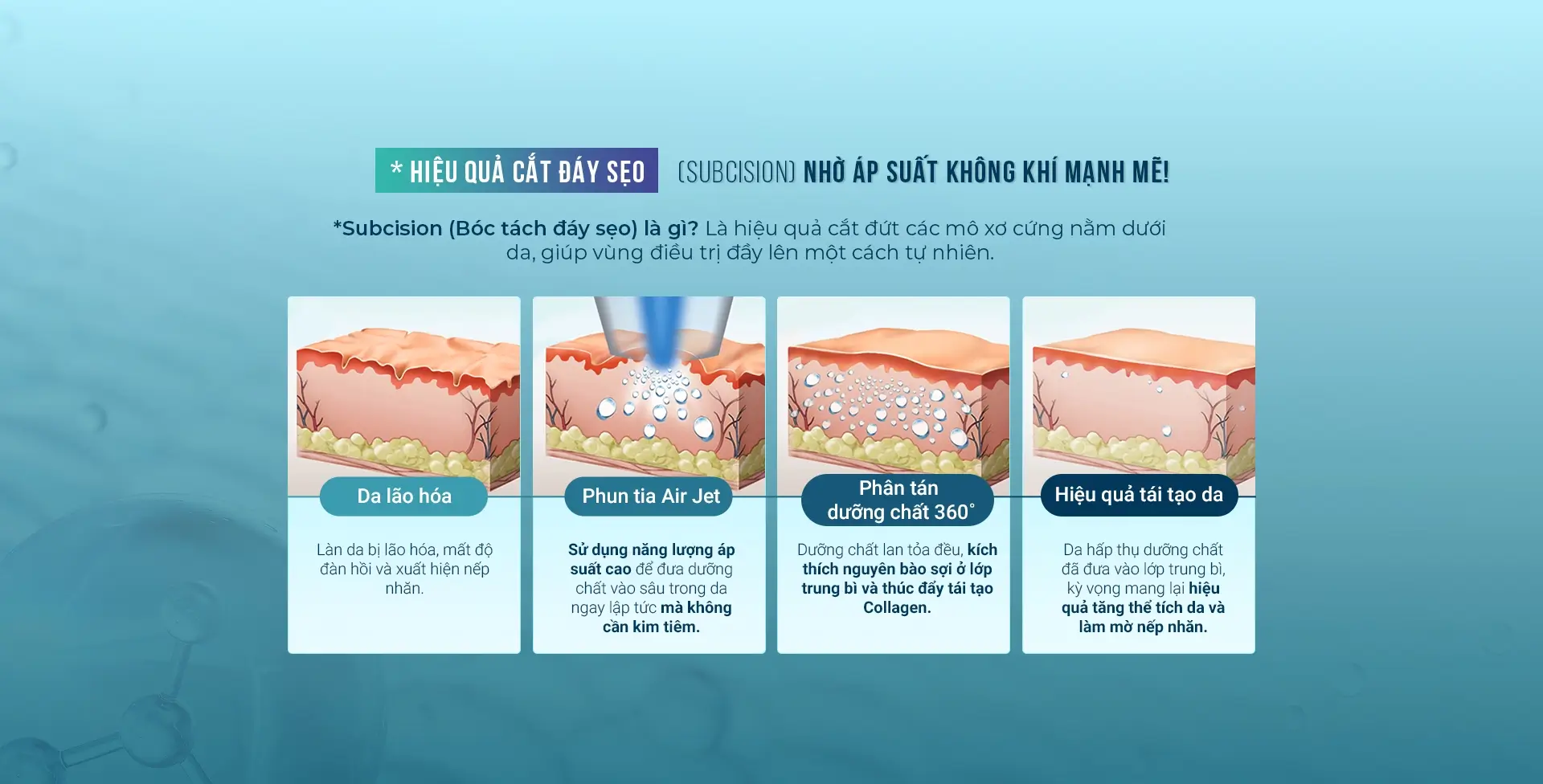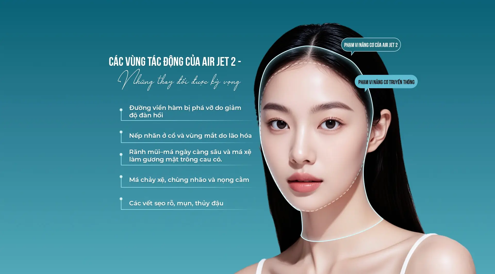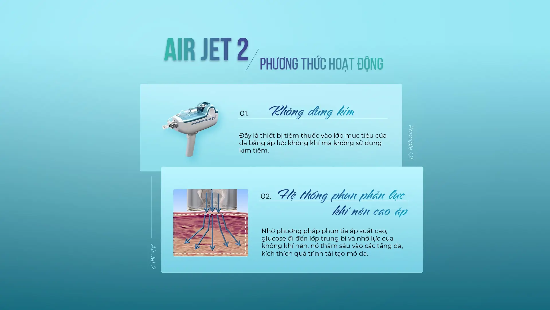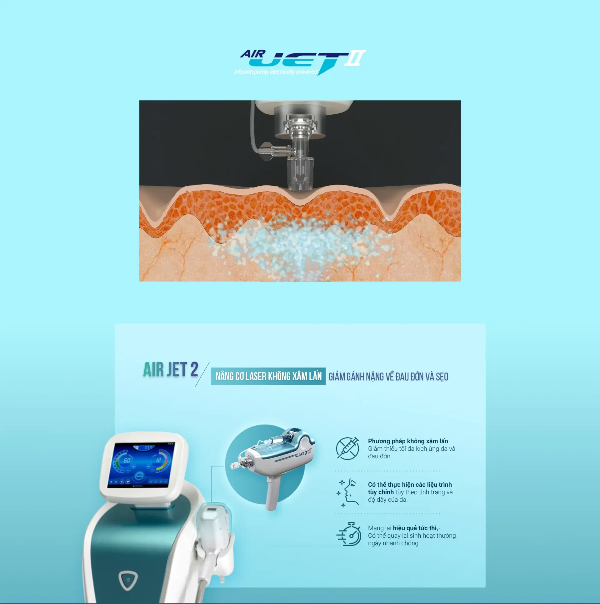 Là phiên bản nâng cấp từ Air Jet 1, Air Jet 2 sử dụng công nghệ phun phản lực nén áp suất cao để đưa dưỡng chất nhanh chóng vào lớp trung bì, đồng thời phá vỡ mô sợi ngay dưới nền sẹo, từ đó kích thích tái tạo da và collagen, giúp cải thiện độ săn chắc và đàn hồi của mô da.