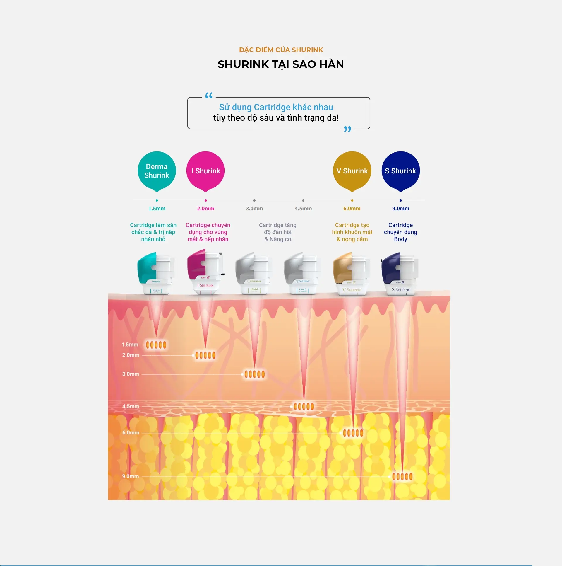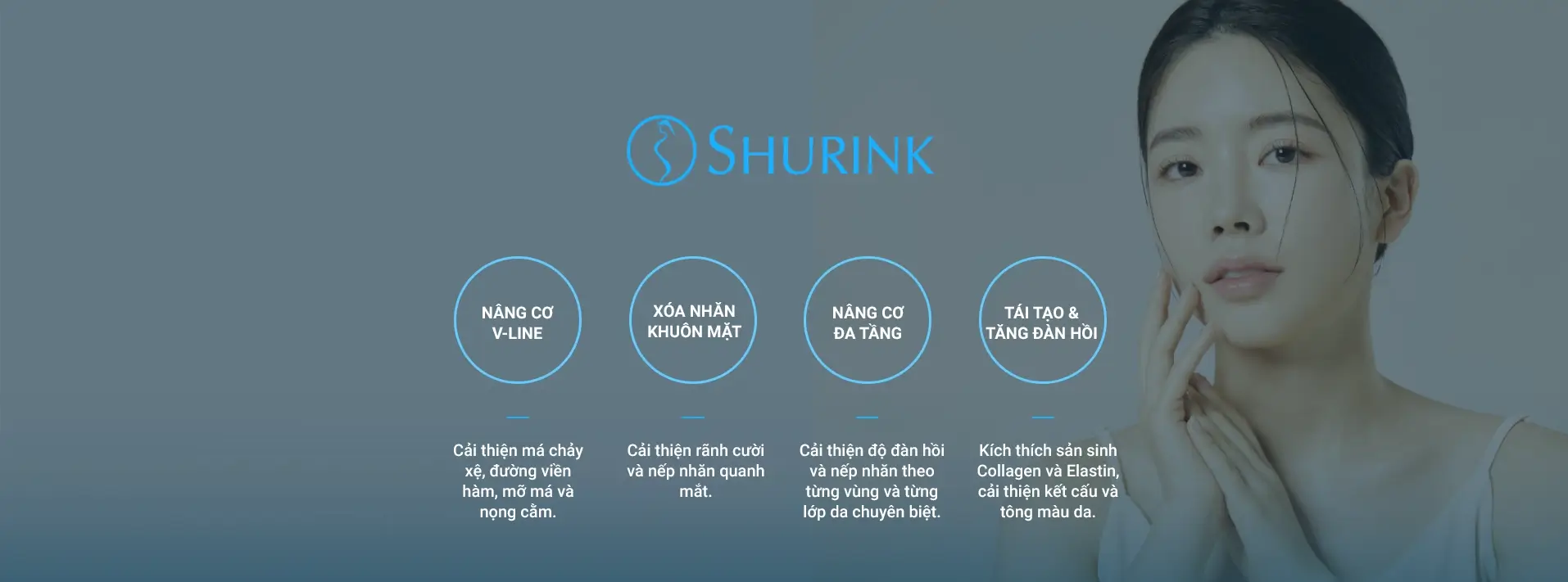 Shurink là thiết bị nâng cơ sử dụng sóng siêu âm, hội tụ năng lượng vào lớp cân cơ (SMAS) mà hầu như không gây tổn thương bề mặt da, giúp co rút các mô bị chùng nhão và mang lại hiệu quả nâng cơ.